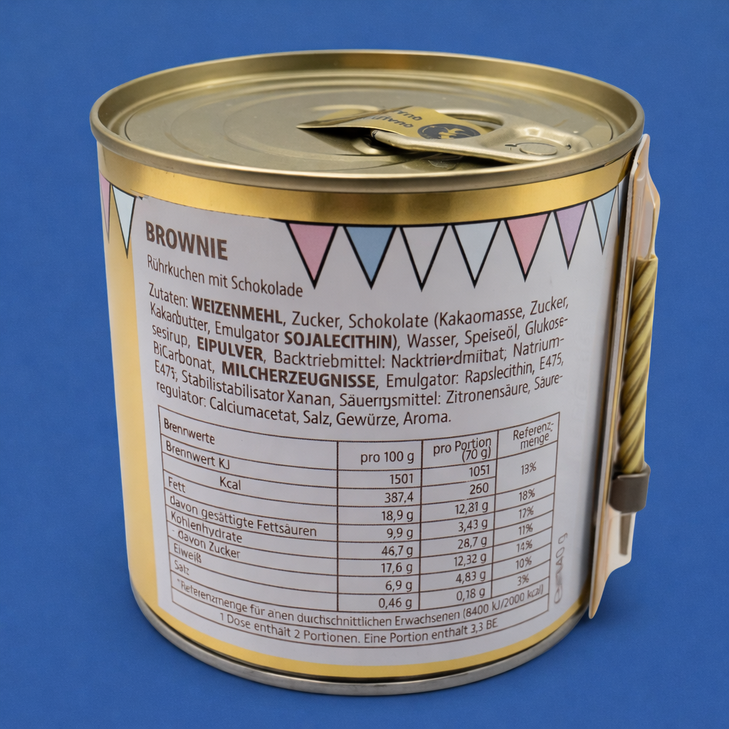 Der Cancake ist die geniale Geschenkidee für spontane Überraschungen oder festliche Anlässe wie Geburtstage und Hochzeiten. Dieser sofort genussbereite Kuchen-To-Go ist ein saftiger Brownie und kommt inklusive einer eleganten, kleinen goldenen Kerze. Unsere Cancakes werden direkt in der Dose in unserer deutschen Traditionsbäckerei (Made in Germany) gebacken.