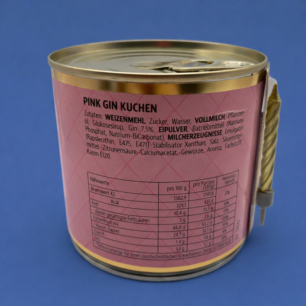 Für alle Gin-Liebhaber: ein saftiger Ginkuchen mit Kuchenkerze in einer toll gestalteten Dose mit rosa Design. Perfekt für Geburtstage, besondere Anlässe oder einfach als Überraschung für Freunde.